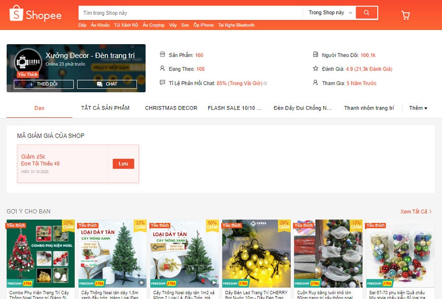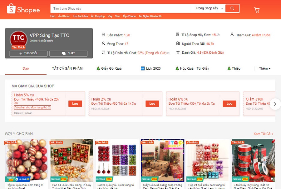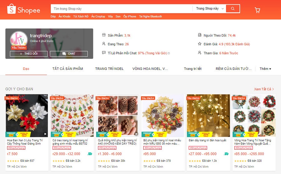 Đây là cửa hàng chuyên các mặt hàng trang trí nội ngoại thất, tốc độ gửi hàng vô cùng nhanh chóng. Sắp tới giáng sinh mà chưa biết mua gì để trang trí cây thông Noel thì hãy tham khảo shop này, đảm bảo bạn sẽ bị ngập tràn trong muôn vàn sản phẩm mẫu mã nơi đây. Shop cũng có rất nhiều voucher giảm giá đặc biệt nên các sản phẩm đã rẻ nay lại càng rẻ hơn nữa. Chính sách quyền lợi đối với khách hàng cũng rất chu đáo, nếu có lỗi xảy ra shop sẽ đổi trả mẫu mới hoặc hoàn tiền lại cho quý khách hàng.