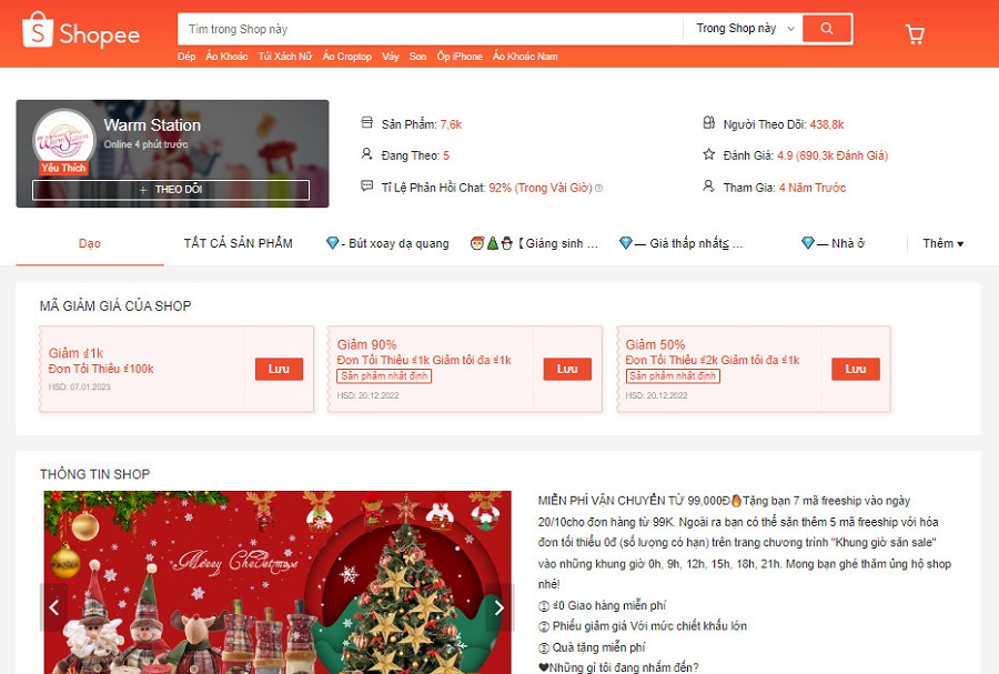 Warm Station là cửa hàng bán rất nhiều đồ tiện ích cho gia đình và cửa hàng cũng bán những phụ kiện trang trí cây thông Noel thu hút được rất nhiều lượt mua. Tại shop, nếu bạn mua qua ứng dụng Shopee, bạn sẽ được miễn phí vận chuyển nếu đơn hàng của bạn có giá trị hơn 99 nghìn đồng. Ngoài ra, tại Warm Station sẽ có rất nhiều khung giờ săn sale cho khách hàng của họ có thể mua sản phẩm với mức giá ưu đãi nhất mà không phải đợi shop tung voucher giảm giá.
