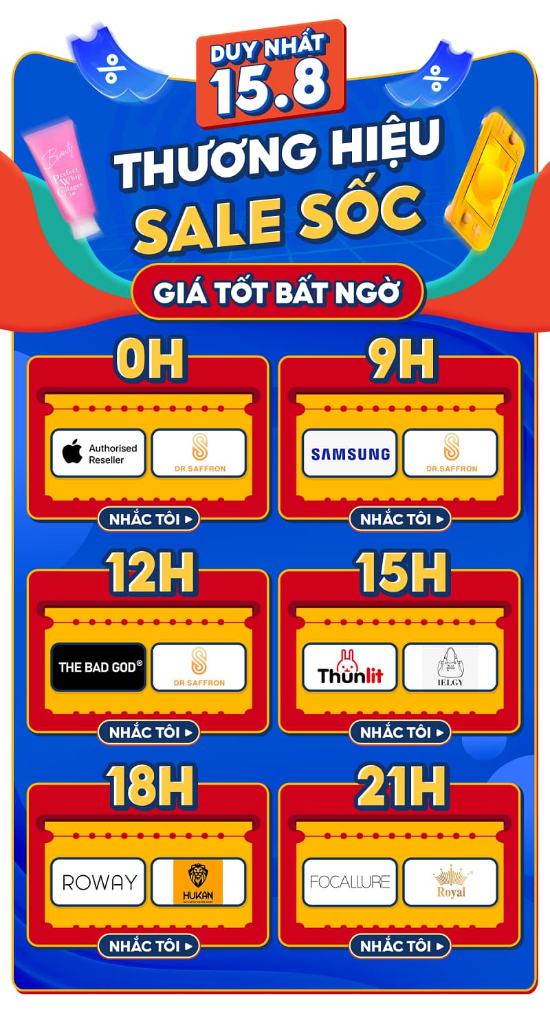 Sự kiện sale 15.8 này có sự góp mặt của các thương hiệu nổi tiếng trên toàn thế giới như: Apple, Samsung, Dior, Louis Vuitton, The Bad God, Thun Lit, Roway…