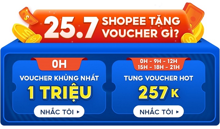 - Voucher giảm 257K cho đơn từ 257K vào 0h, 9h, 12h, 15h, 18h, 21h ngày 25/7