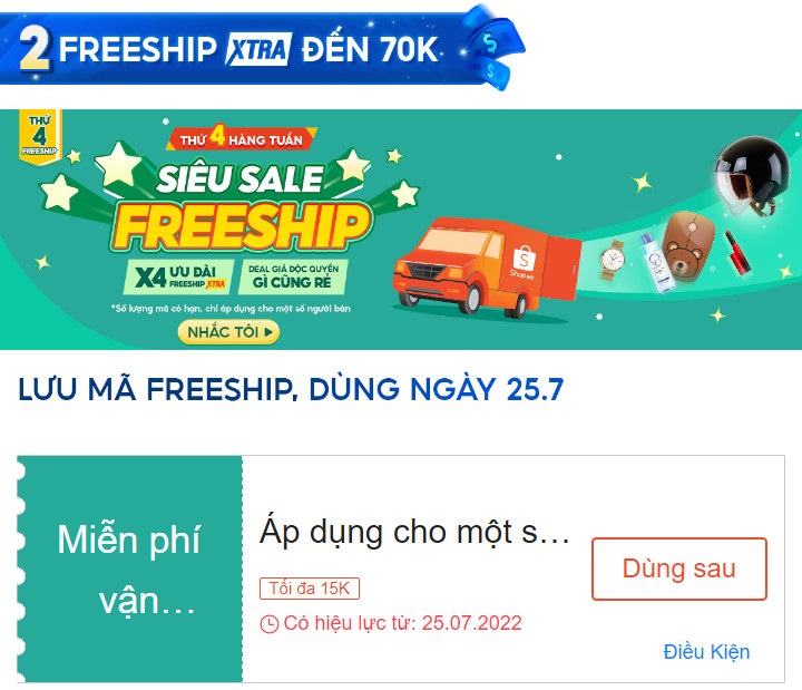 Nhân dịp sale hấp dẫn lần này, Shopee sẽ mạnh tay tung ra hàng loạt voucher Freeship Xtra giảm đến 70K vào lúc 9H, 12H và 18H mỗi ngày trong thời gian diễn ra chương trình Shopee 25.7. Bên cạnh đó là nhiều mã Freeship đơn từ 0Đ, mã Freeship toàn sàn mà bạn có thể săn thêm để không tốn bất kỳ tiền ship nào.