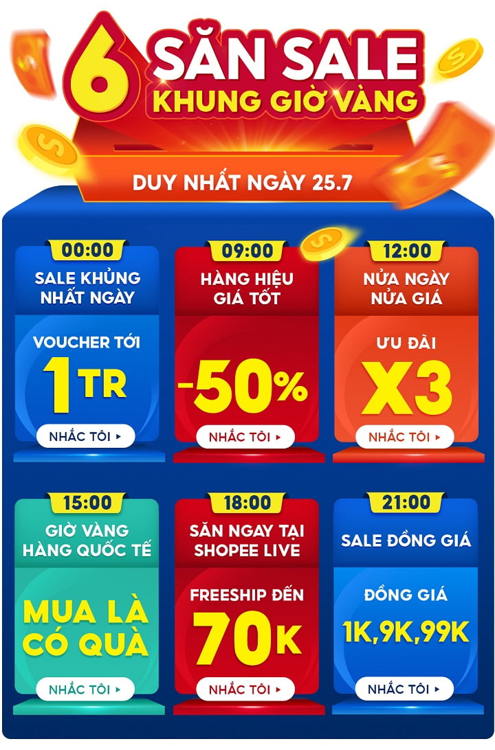 Đương nhiên khi biết lịch săn sale Shopee 25.7 thì bạn cũng nên để ý đến khung giờ săn sale để có thể rinh về nhiều sản phẩm rẻ, hấp dẫn mà bạn không thể bỏ lỡ. Dưới đây là 6 khung giờ săn sale 25.7 lần này như sau: