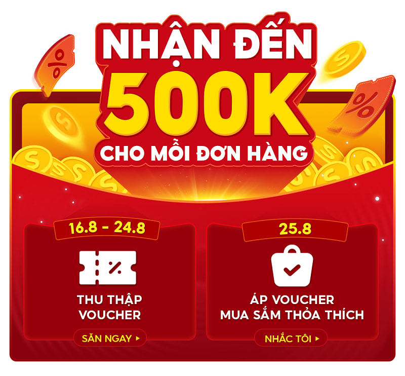 Ngoài ra, bạn có cơ hội nhận Voucher giảm giá lên đến 500K cho mỗi đơn hàng. Bạn bắt đầu thu thập Voucher từ ngay 16/8 đến ngày 24/8/2022. Đến ngày 25/8/2022 là khoảng thời gian diễn ra chương trình thì bạn có thể áp Voucher mà mua sắm thỏa thích.