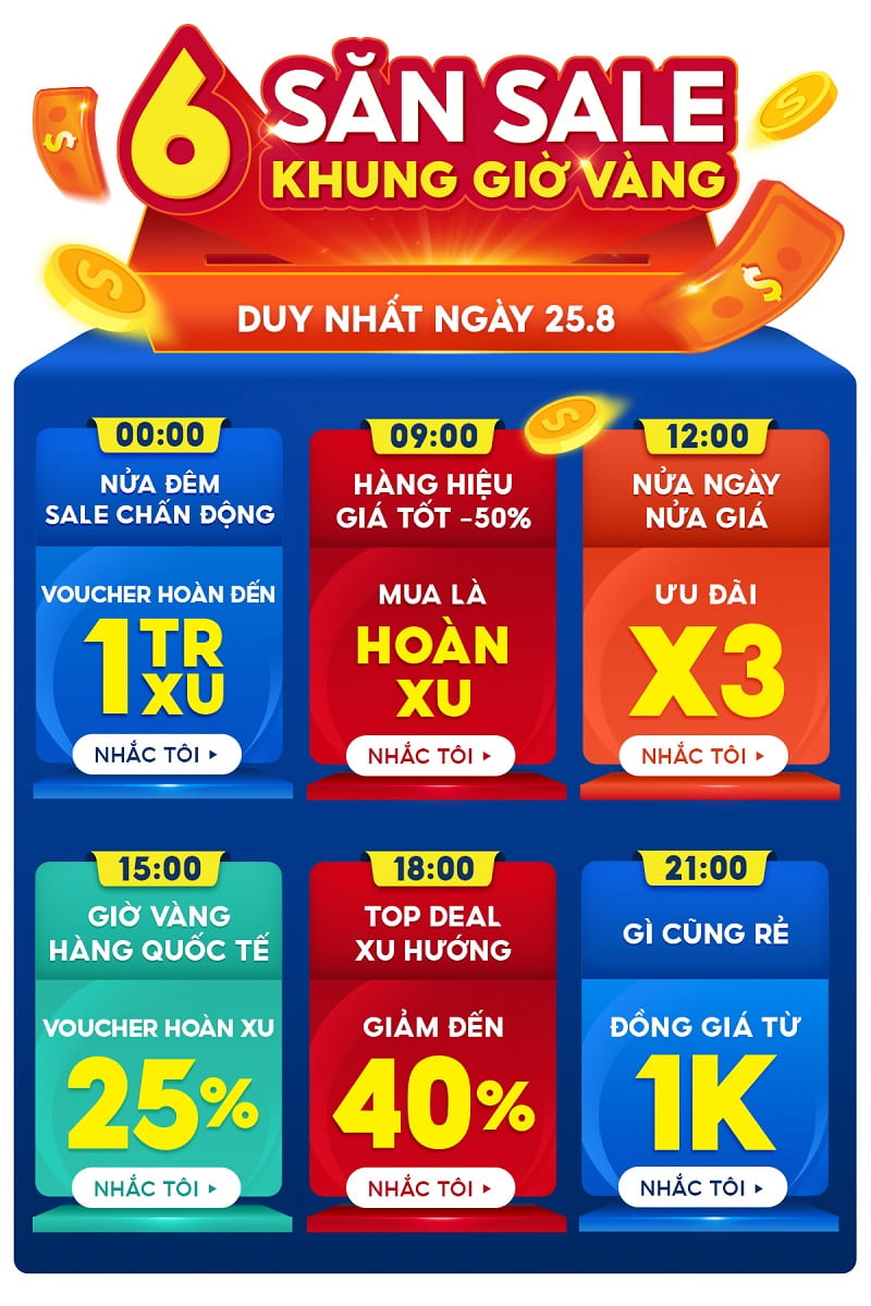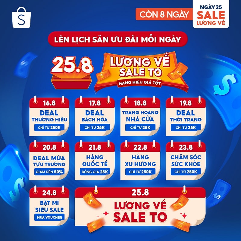 Sau đây, chúng tôi sẽ liệt kê cho bạn lịch săn sale 25.8 từng ngành hàng trong thời gian chương trình diễn ra.