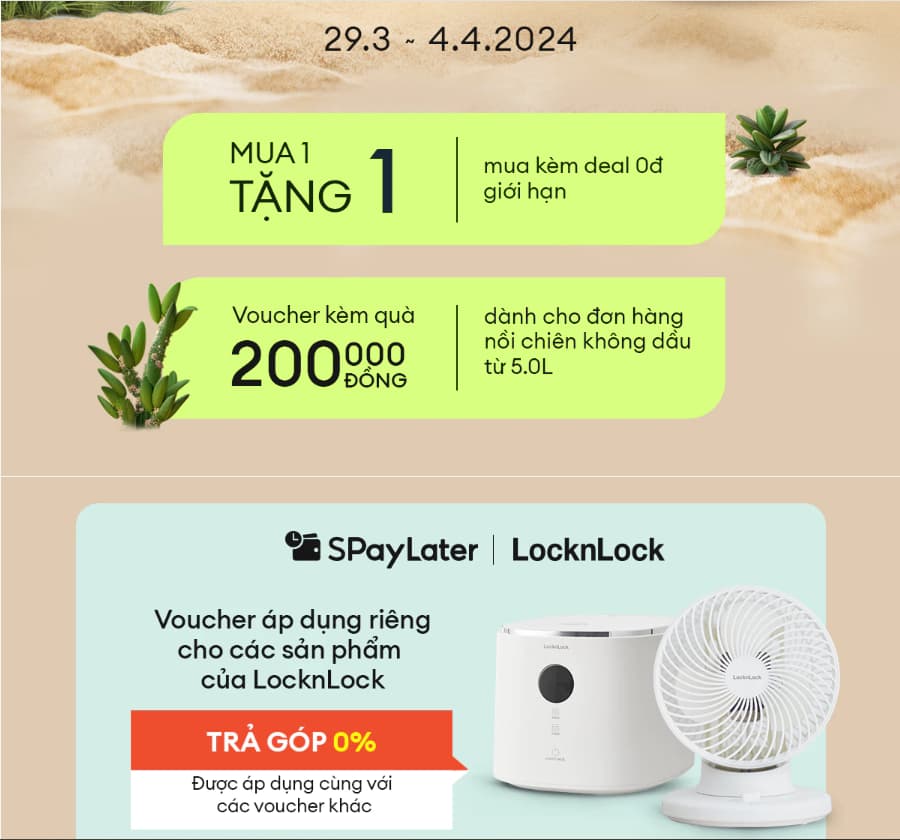 - Voucher 200K kèm quà dành cho đơn hàng nồi chiên không dầu từ 5L.