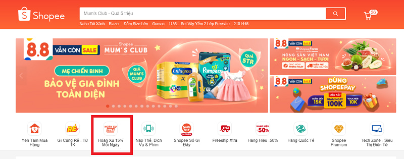 - Sau đó, tại trang chủ bạn kéo và tìm mục Hoàn xu 6% lên đến 200K để lấy mã hoàn xu.