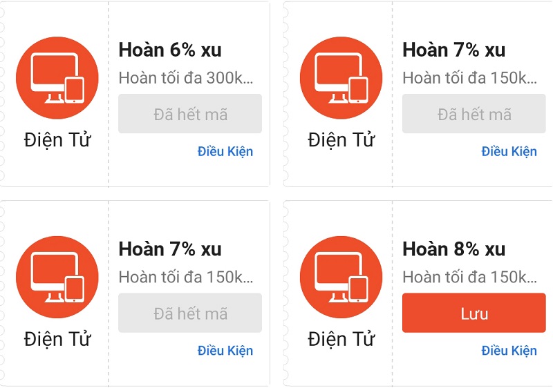 - Ấn vào mục Hoàn xu 6%, lướt xuống tìm kiếm mã hoàn xu mà bạn muốn sử dụng.