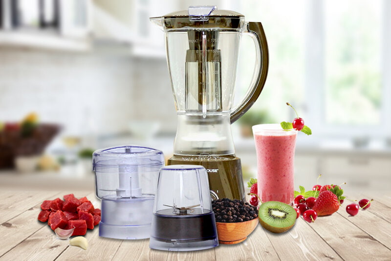 - Bộ sản phẩm có 3 cối xay với 3 lưỡi dao riêng biệt: 1 cối xay thịt, 1 cối xay sinh tố rau, củ, quả và 1 cối để xay đồ khô.