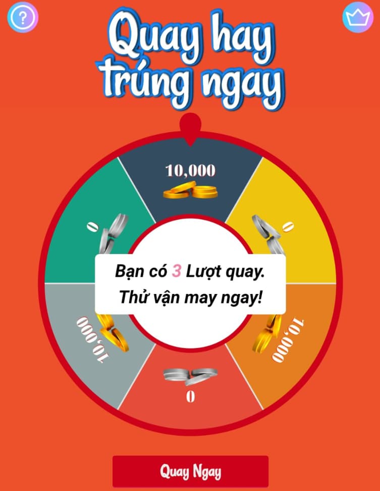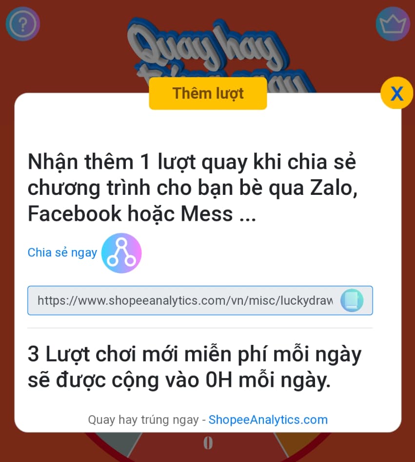 Mỗi ngày bạn sẽ nhận được 3 lượt quay miễn phí. Khi bạn chia sẻ minigame cho bạn bè qua Zalo, Facebook... bạn sẽ nhận thêm một lượt quay.