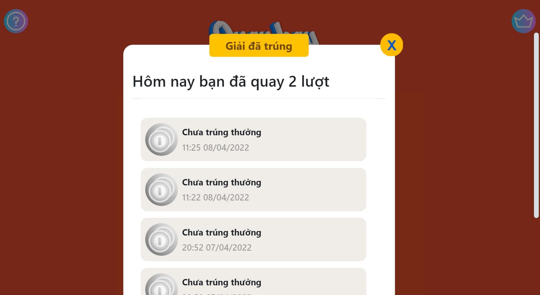 Để xem lại lịch sử quay và các giải đã trúng bạn nhấn vào icon bên phải góc trên để mở lịch sử quay.