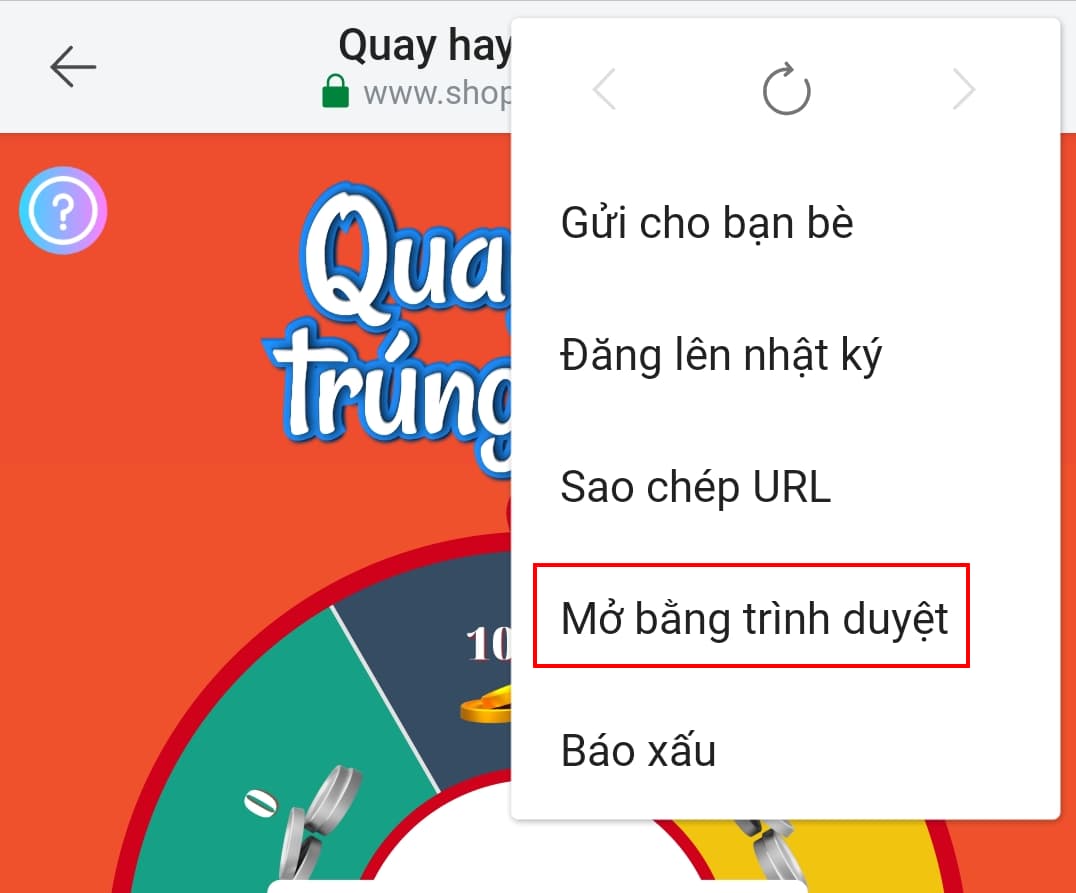 Để mở website trong trình duyệt bạn nhấn vào dấu 3 chấm bên phải ở trên cùng và chọn "Mở website trong trình duyệt" lúc này khi nhấn chia sẻ ngay mới hiện popup chia sẻ.