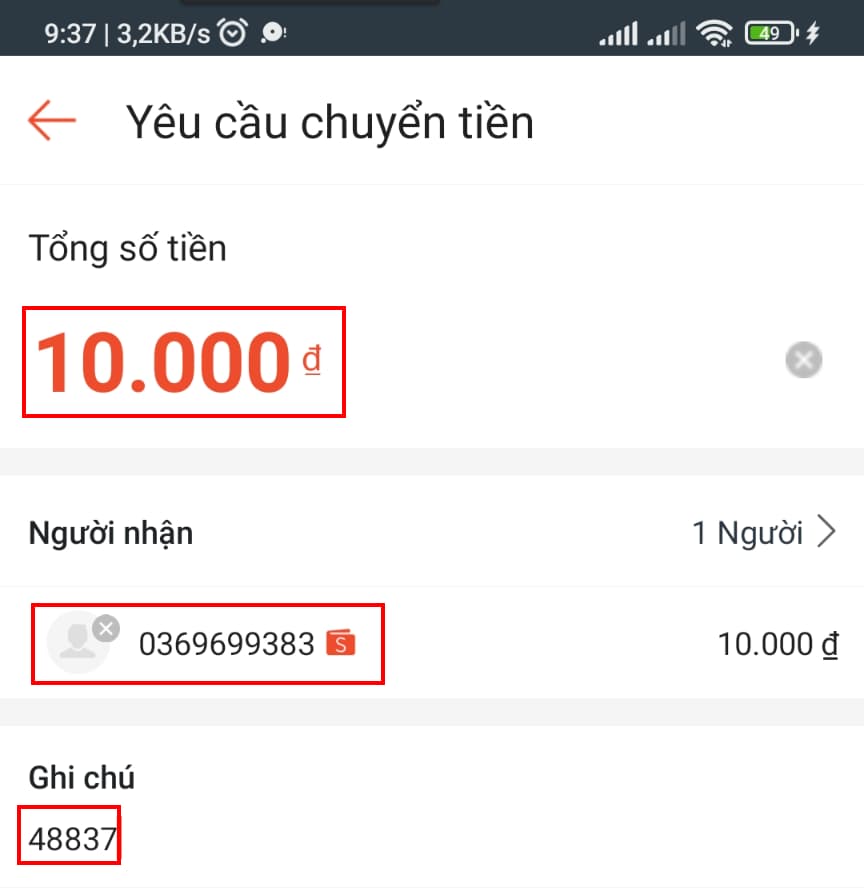 Bước 3: Tổng số tiền 10000 hoặc theo giá trị giải thưởng. Ghi chú nhập mã số nhận thưởng vd: 666666