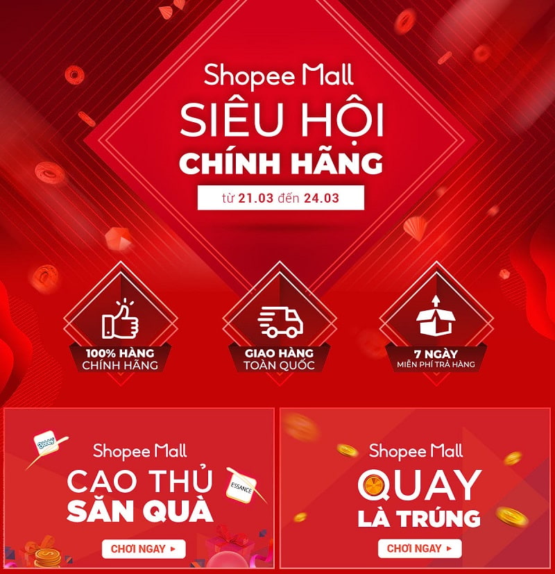 Shopee Mall là một gian hàng của Shopee. Đây là một gian hàng đặc biệt vì bạn có thể mua được các sản phẩm chính hãng 100% tại nơi đây. Các sản phẩm này đều được Shopee kiểm duyệt qua mới đưa đến cho người tiêu dùng nên chúng được đánh giá rất cao. Shopee Mall hiện đang bày bán các sản phẩm từ nhiều ngành hàng, các thương hiệu lớn nhỏ trên thế giới mà chắc chắn bạn đã từng nghe tên như Samsung, Xiaomi, Honda,...
