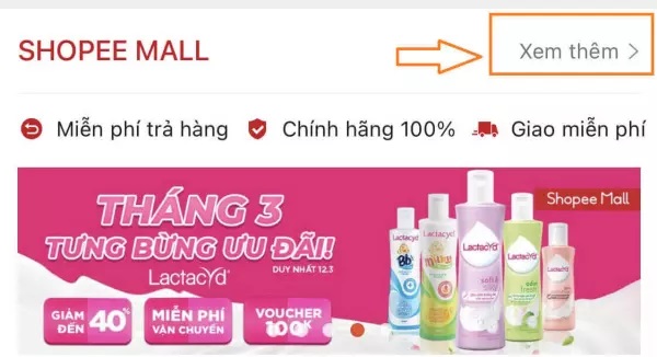 Bước 2: Tại trang chủ Shopee, bạn ấn vào biểu tượng Shopee Mall có ngay ở đó hoặc có thể kéo xuống dưới và thấy mục Shopee Mall thì bạn ấn Xem thêm.