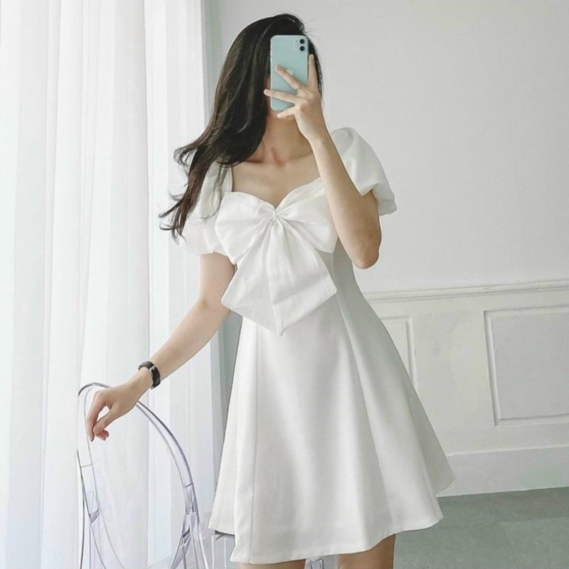 4. Đầm cổ vuông màu trắng, tay phồng nơ to xinh ngất ngây