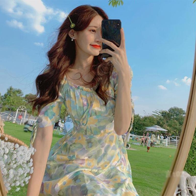 5. Đầm cổ vuông họa tiết hoa nhẹ nhàng, chiết eo cao siêu xinh