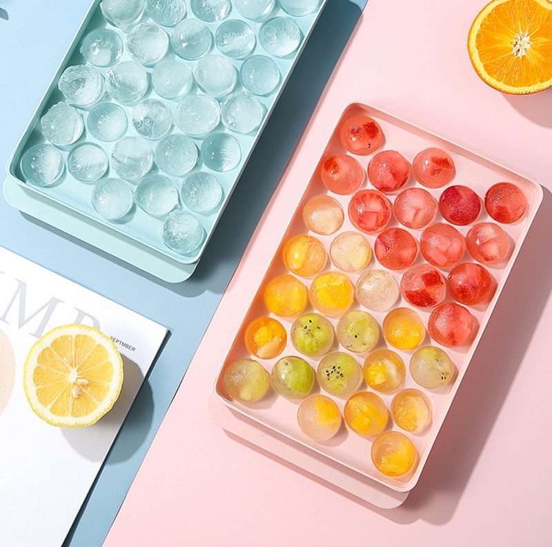 Đầu tiên, chúng tôi giới thiệu cho bạn chiếc khuôn siêu xinh, tô điểm thêm cho cốc nước của bạn thêm dễ thương và ngộ nghĩnh hơn, vừa đẹp lại vừa giảm được cơn khát.Khuôn có 2 màu là màu xanh và hồng, hai màu được cho là rất xinh và dễ thương. Khuôn bao gồm 33 viên, 2 khay úp vào nhau và kiểu dáng của nó là dạng tròn tròn xinh xinh.