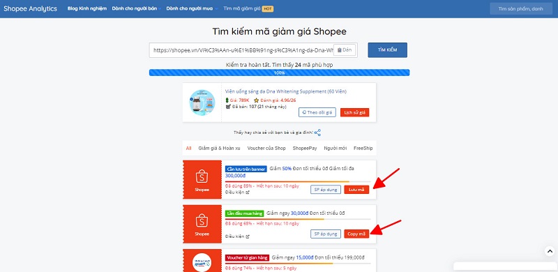 Bước 4: Chờ hệ thống chạy vài giây rồi hiển thị các mã giảm giá phù hợp với sản phẩm của bạn. Bạn chỉ việc Lưu mã hoặc Copy mã sau đó áp dụng cho đơn hàng trên Shopee khi thanh toán.