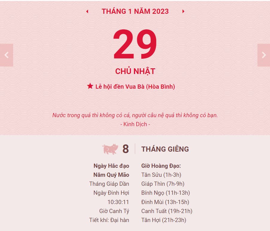 - Lịch Âm: 08/01/2023 (Ngày Đinh Hợi, tháng Giáp Dần, năm Quý Mão).