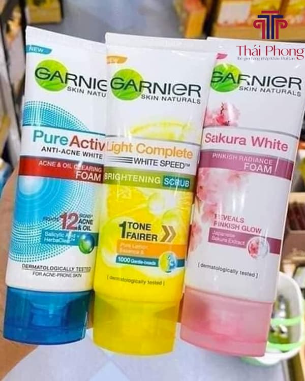 - Sữa rửa mặt: Sữa rửa mặt Garnier với công thức tạo bọt bổ sung vitamin C dịu nhẹ lấy đi bụi bẩn và bã dầu bám vào lỗ chân lông, cải thiện vùng da xỉn màu mà không làm khô da. Sau khi rửa làn da mềm mịn và sáng rạng, tràn đầy sức sống ngay sau khi sử dụng lần đầu tiên. Nhờ đó, nguyên nhân gây mụn được phá bỏ, da sạch thoáng cho quy trình chăm sóc hoàn hảo hơn.