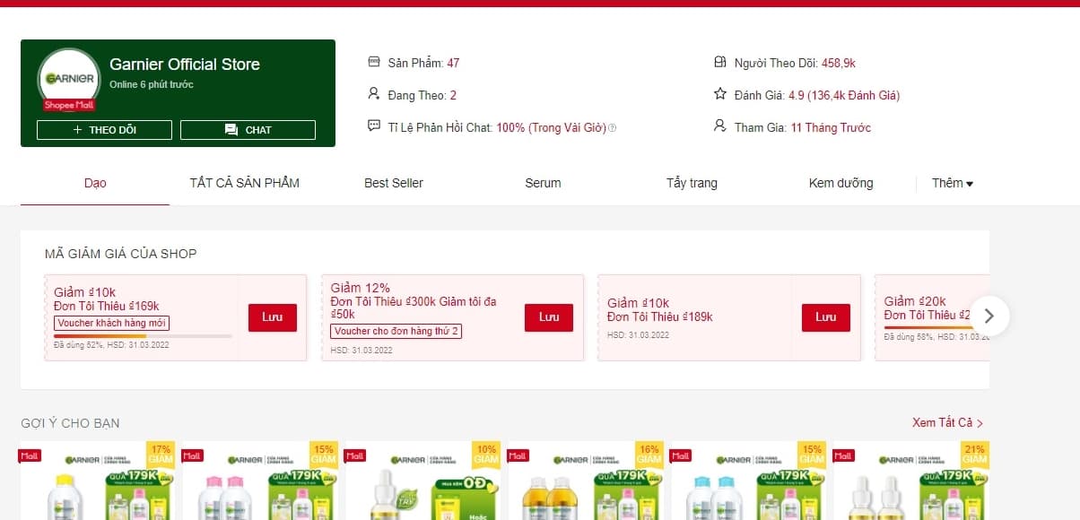 Tại Shopee Mall, cửa hàng mỹ phẩm Garnier chính hãng sở hữu 458,9 k lượt người theo dõi, 4,9 k đánh giá (với 136,4 k đánh giá). Tham gia thị trường Shopee Mall 11 tháng trước.