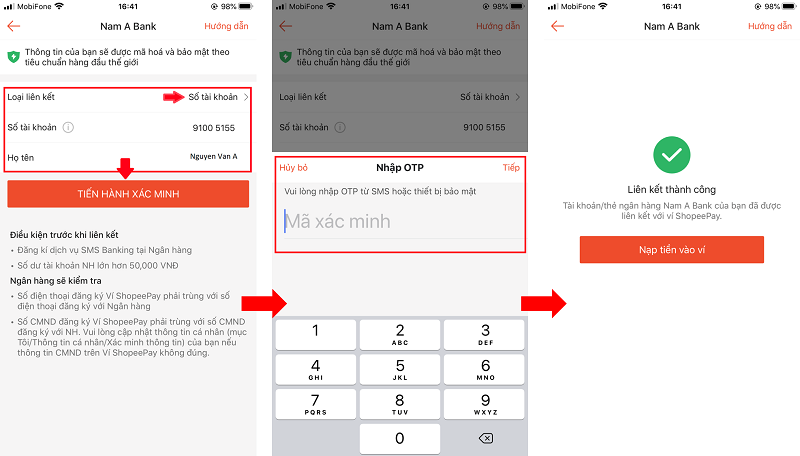 - Thông tin đăng ký trên tài khoản ngân hàng phải trùng với tài khoản ShopeePay và tài khoản Shopee như Họ và tên, Số điện thoại, CMND/CCCD.
