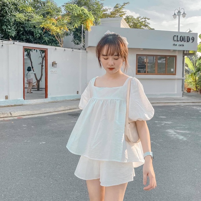 Bộ bèo tiểu thư này được làm từ chất đũi - là chất liệu phổ biến những năm gần đây. Sản phẩm bao gồm áo cộc dây lưng thắt nơ và một chiếc quần short. Áo được thiết kế tay bồng, có phần dây cột nơ siêu dễ thương. Quần short mặc thoải mái với phần cạp bo chun vừa vặn, dễ mặc cho nhiều form người. Bộ đũi này có thiết kế đơn giản, không quá cầu kỳ hay có nhiều màu sắc sặc sỡ mà có máu trắng tinh khôi, dễ mặc.
