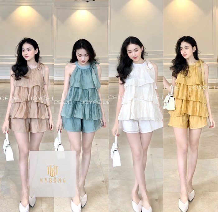 Đây là thiết kế mới nhất, độc đáo, trẻ trung và mang tới cho các nàng cảm giác thoải mái khi đi dạo phố, hẹn hò, đi cafe,... Set bộ nữ bao gồm áo sát nách cổ nơ 3 tầng và quần sooc ống rộng trông vô cùng sang chảnh, bánh bèo đúng nghĩa. Sản phẩm có chất lượng vải cao cấp, bền đẹp với màu sắc trẻ trung, tươi tắn, dễ thương. Có 2 size cho các nàng lựa chọn và 5 màu là màu nâu, trắng, xanh, ngọc, vàng.