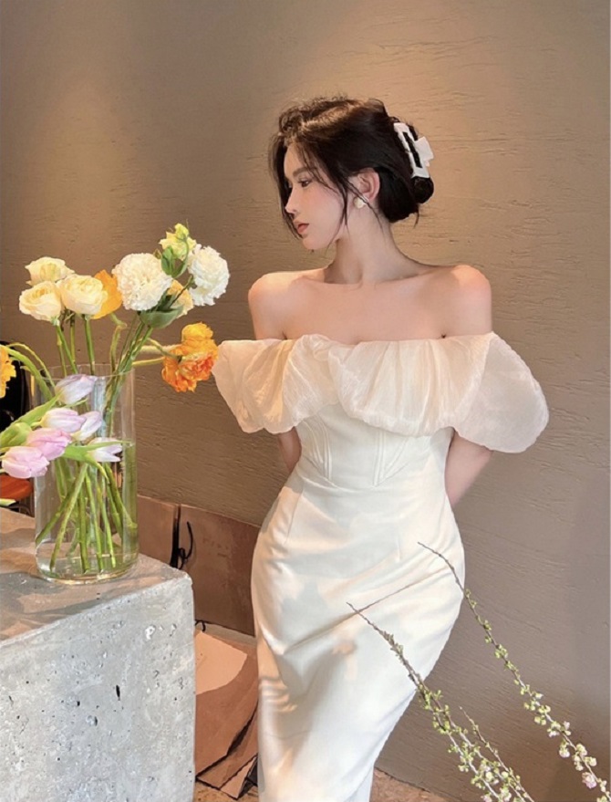 Phần cổ đẹp mắt của chiếc đầm dáng dài trễ vai nữ tính sẽ giúp tôn lên phần vai quyến rũ mà còn khiến nàng trở nên sành điệu hơn. Chiếc đầm dáng dài màu trắng sẽ làm nàng thêm phần sang trọng, quý phái. Đây là gợi ý tuyệt vời dành cho những cô nàng phong cách bánh bèo.