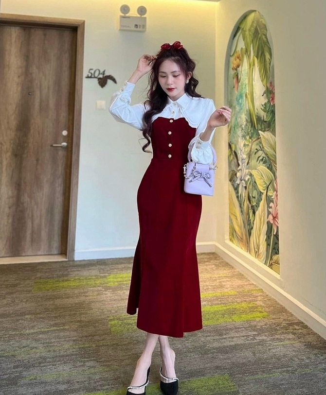 Bạn muốn Tết này xuất hiện thật chỉn chu, lịch thiệp, thiết kế đầm đuôi cá, tay dài phối sơ mi sẽ không khiến bạn thất vọng. Phần thân váy bên dưới ôm vào body sẽ giúp nàng phô diễn đường cong nóng bỏng nhưng cũng rất tinh tế khi phần trên được phối cùng áo sơ mi tay dài.