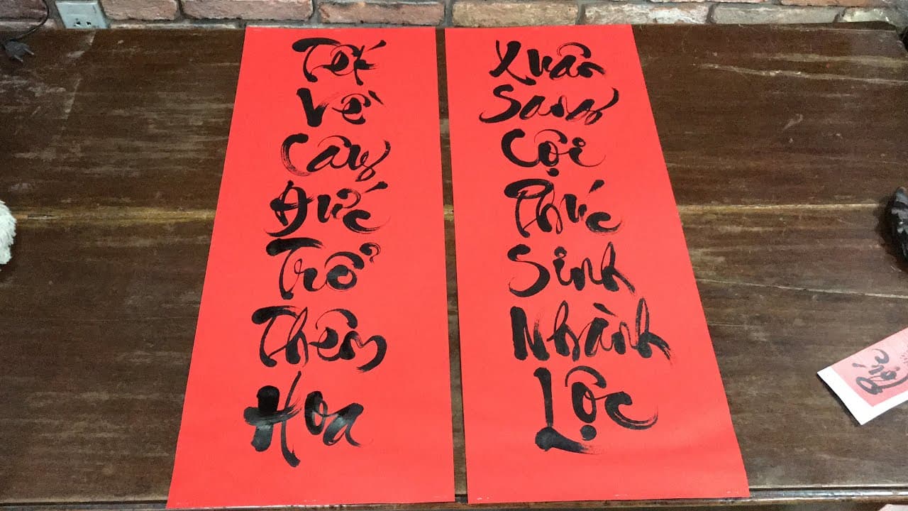 - Câu đối đỏ chữ thư pháp viết tay phù hợp để trang trí Tết, trang trí không gian truyền thống.