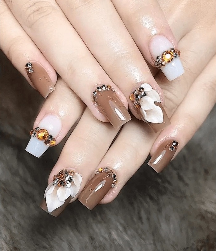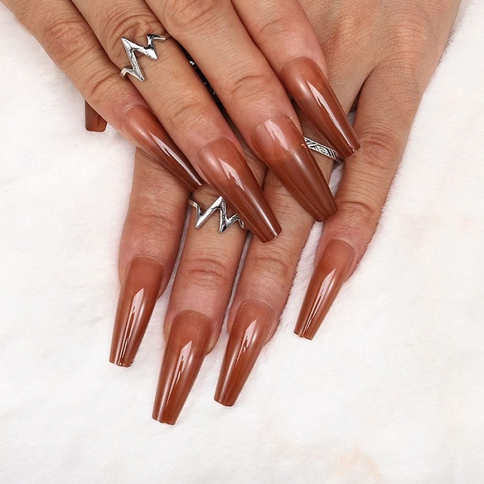 Màu nâu là màu nail tạo nên sức hút, sự sang chảnh dành cho các nàng da ngăm. Sơn móng tay màu nâu nhẹ nhàng, không mấy nổi bật nhưng lại mang đến vẻ nữ tính, cuốn hút, che đi khuyết điểm dáng móng. Ngoài ra, bạn có thể trang trí thêm cho bộ nail những họa tiết chấm bi, kẻ dọc hoặc các hình vẽ theo sở thích của bạn.
