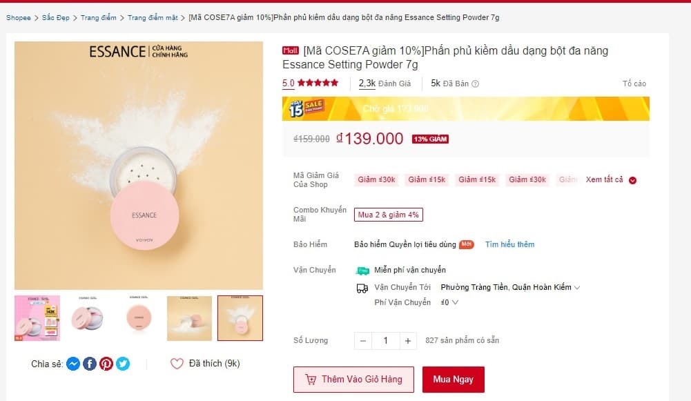 Người dùng có thể mua ở cửa hàng mỹ phẩm chính hãng trên toàn quốc. Với những khách hàng có thói quen mua sắm trực tuyến tại sàn thương mại điện tử thì Shop Mall là lựa chọn lý tưởng nhất. Sản phẩm phấn phủ Essance Setting Powder được ưu đãi giá cực kì hấp dẫn, hàng chính hãng và giao hàng nhanh chóng tiện lợi, tiết kiệm thời gian và chi phí đi lại cho khách hàng.