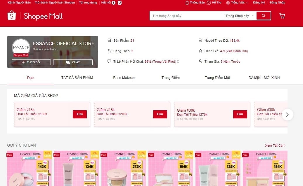 Essance Official Store - Cửa hàng Essance chính hãng trên Shopee sở hữu 153,4 K người theo dõi, 24 K lượt đánh giá
