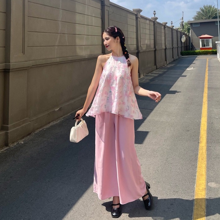 Mix quần ống rộng với áo cổ yếm