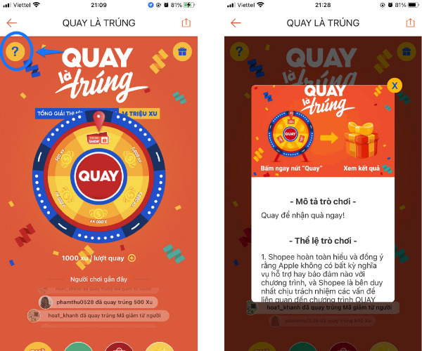 - Nếu như bạn muốn tìm hiểu chi tiết về thể lệ trò chơi hay giải thưởng mà bạn có thể nhận được khi tham gia game Quay là trúng Shopee thì bạn có thể bấm vào dấu hỏi giao diện chơi game nha.