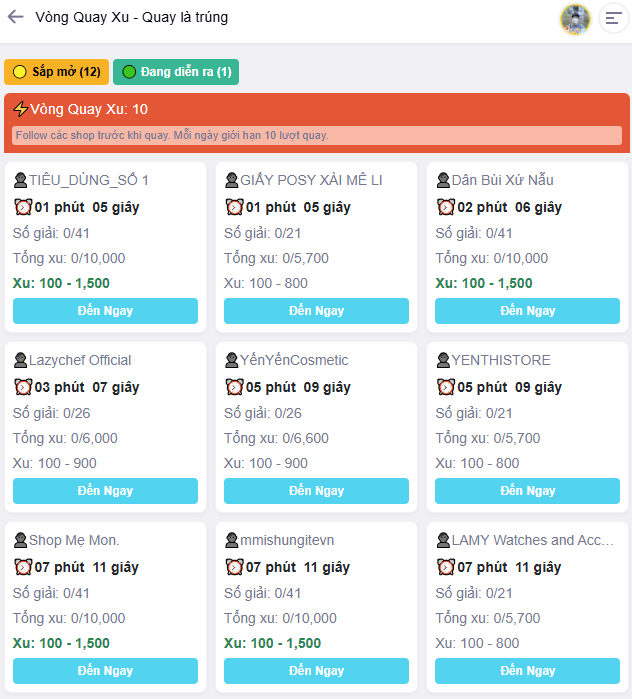 - Bạn nên chọn chơi game vào những khung giờ vàng của Shopee để có cơ hội nhận được giải thưởng có giá trị cao hoặc những giải thưởng đặc biệt như là 1 triệu Xu Shopee, Voucher giảm giá 500K, Phần quà 0Đ từ Shopee,...