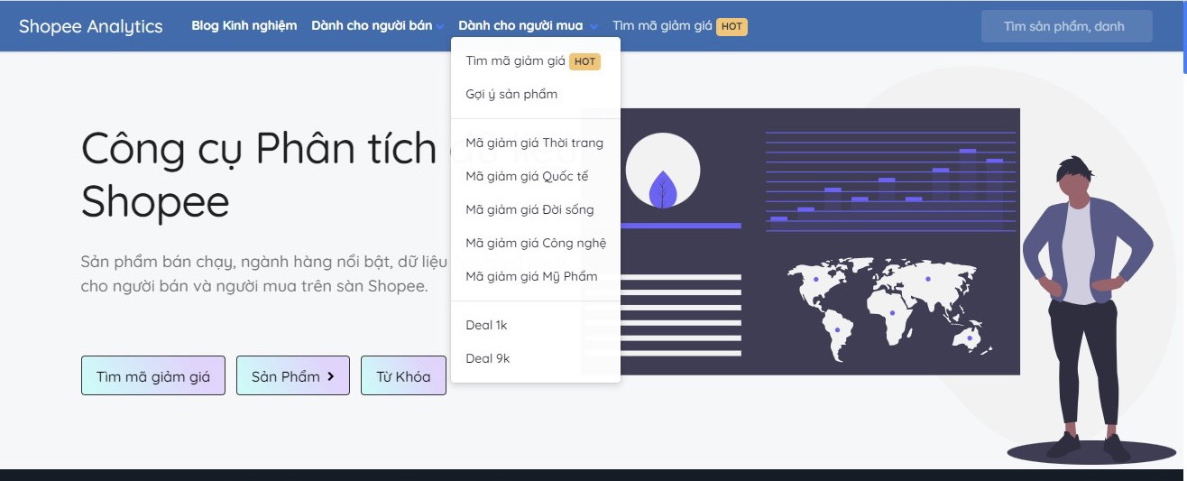 Truy cập vào trang web https://www.shopeeanalytics.com/. Tại phần trang chủ, chọn Dành cho người mua. Sau đó, bạn ấn Tìm mã giảm giá hoặc có thể truy cập đường link TẠI ĐÂY.
