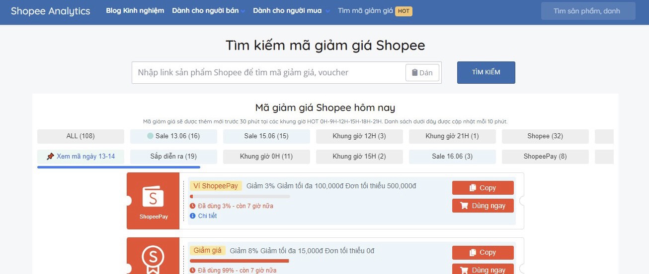Sau đó, bạn sẽ tìm thấy đầy đủ các mã giảm giá cho toàn sàn hoặc từng gian hàng cụ thể. Để xem sản phẩm mà bạn muốn mua có mã giảm giá nào hay không thì bạn có thể nhập trực tiếp link sản phẩm vào ô Tìm kiếm.