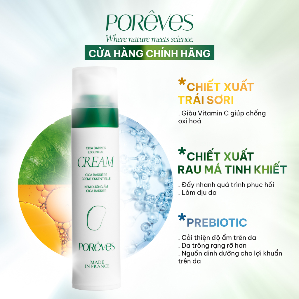 - Công dụng: Với thành phần chủ đạo là rau má, kem dưỡng PORÊVES Cica Barrier Essential Cream không chỉ giúp cấp ẩm, giữ da căng bóng mà còn có tác dụng làm dịu, phục hồi da tổn thương đồng thời còn bổ sung Vitamin C nhằm bảo vệ da tối đa trước tại hại từ môi trường.