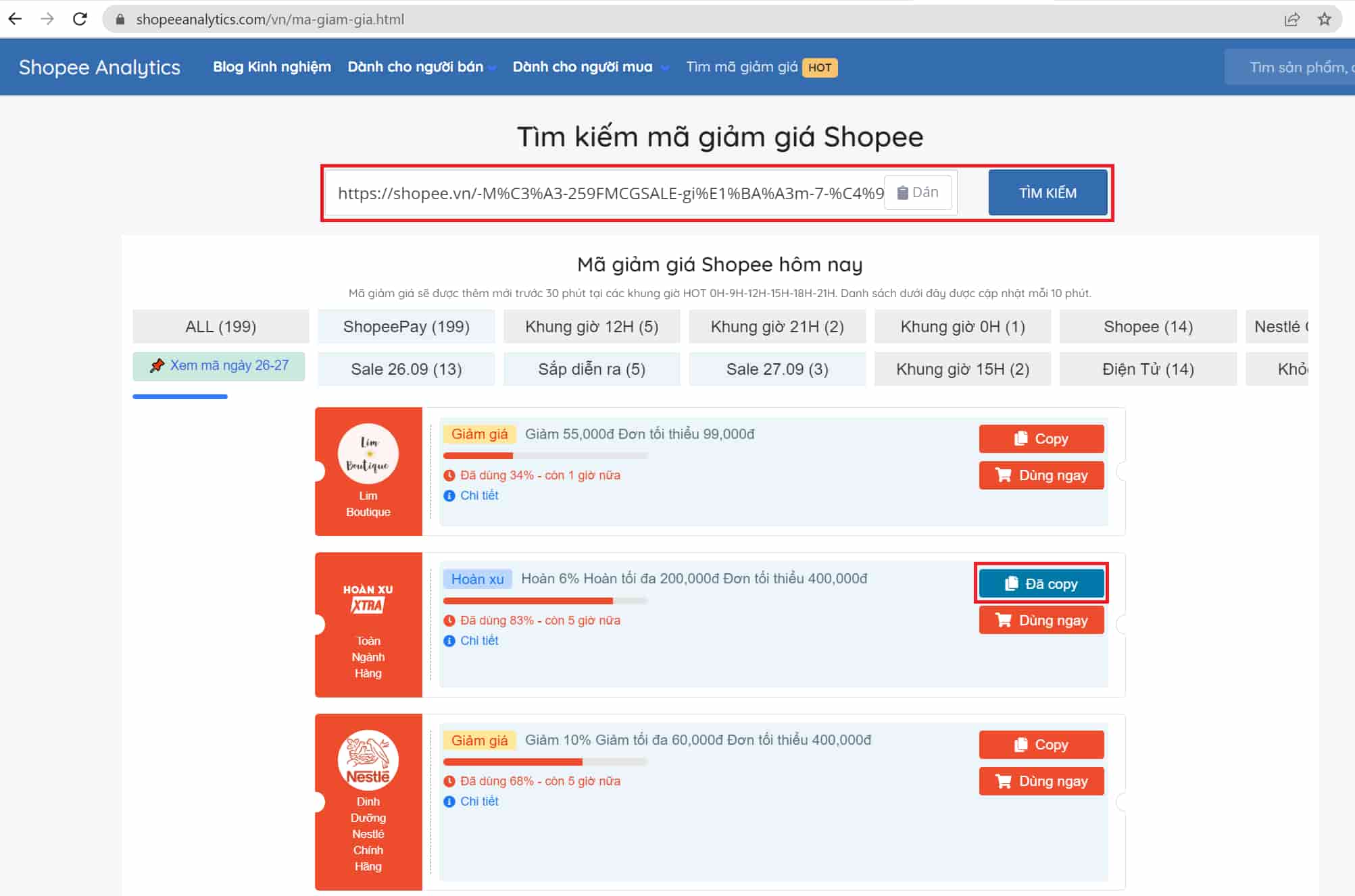- Bước 2: Vào ShopeeAnalytics.com click chọn "Tìm mã giảm giá" rồi dán link sản phẩm collagen dạng nước DHC Beauty 7000 Plus mà bạn đã copy ở bước 1, sau đó chọn và copy mã giảm giá phù hợp ở ngay bên dưới.