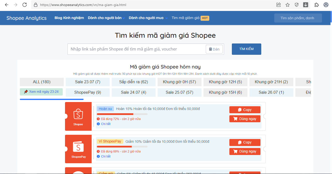 BƯỚC 2: Truy cập vào mục MÃ GIẢM GIÁ tại trang Shopeeanalytics. Sau đó dán link sản phẩm đã sao chép ở bước 1 vào ô tìm kiếm, Enter và sau đó các mã giảm giá siêu HOT sẽ hiện ra, bạn chỉ cần chọn mã bạn muốn rồi copy là xong.