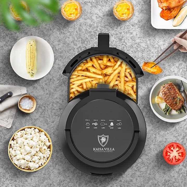 Nồi chiên không dầu Kaisa Villa dung tích 5L với dung tích lớn, chương trình nấu đa chức năng: Khoai tây chiên, cánh gà, bít tết, ba chỉ quay, thịt chiên xù... Nồi có khả năng làm nóng nhanh, không khí nóng tuần hoàn với mức nhiệt lên đến 200 độ C, thay thế dầu nóng và giảm khả năng hấp thụ chất béo.