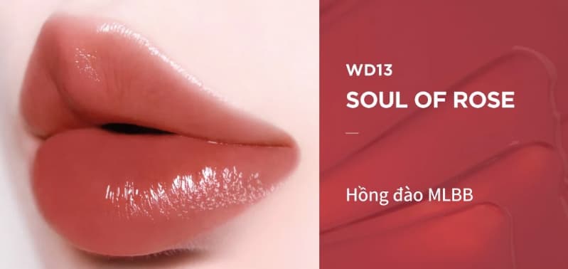 - WD13 (màu hồng đào): Khi thoa lên môi sẽ có sắc hồng với một chút ánh cam. Lớp tint dưới môi có độ bám siêu lâu, đem lại cho bạn một đôi môi căng bóng siêu “lung linh”.