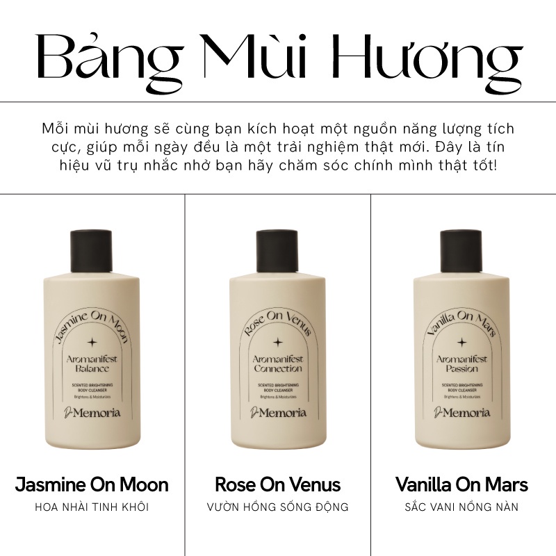 - Sữa tắm De Memoria Scented Brightening Body Cleanser 300ml – Hương hoa Hồng tươi quyền lực (Rose On Venus). Hương đầu Cam Bergamot, Hương giữa Hoa Hồng và hương cuối Hoắc hương). Hương thơm sau khi tắm sẽ mang tới mùi ngọt ngào của cả một vườn hồng tươi vô cùng sống động, tạo cảm xúc gần gũi, nồng nhiệt vô cùng quyến rũ, đam mê.