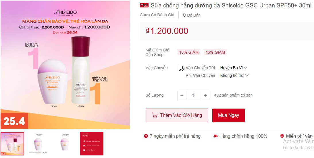 Sản phẩm thứ hai của chương trình Sale Shopee Premium (sale hàng hiệu) tháng 4.2022 đó là sữa chống nắng dưỡng da Shiseido GSC Urban SPF50+. Sản phẩm với chỉ số SPF50+ PA++++ cao nên có công dụng bảo vệ da tối ưu, tránh tác hại của tia UVA/UVB và khói bụi.