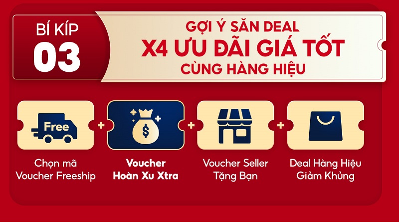 - Bí kíp 03: Bạn có thể dùng nhiều mã giảm giá cùng một lúc như mã Freeship, mã hoàn xu, voucher của người bán tặng bạn và deal hàng hiệu giảm khủng.