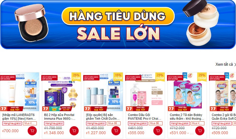 Để đáp ứng niềm vui mua sắm của tất cả mọi người. Ngành hàng tiêu dùng sẽ sale rất lớn trong đợt 7.7 này. Các mặt hàng sẽ được sale xuyên suốt từ 0h-9h–12h-15h-18h-21h.Các bạn chỉ cần đợi đến thời gian, săn các mã giảm giá và chốt đơn thôi nào. Các ngành hàng sale vô cùng đa dạng từ thời trang, công nghệ, mỹ phẩm, đồ gia dụng…