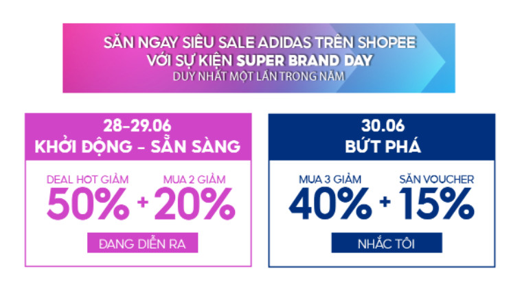 Hòa cùng chương trình giảm giá Super Brand Day tại Shopee 30/6, thương hiệu Adidas đem đến cho khách hàng rất nhiều ưu đãi sốc gồm voucher giảm 2 triệu đồng cùng hàng loạt các sản phẩm hot giảm đến 50%. Nhanh tay cùng chúng tôi điểm danh và lưu ngay các ưu đãi hiếm gặp tới từ hãng nhé. Chi tiết về các mã giảm sẽ được cập nhật tại các phần dưới đây.