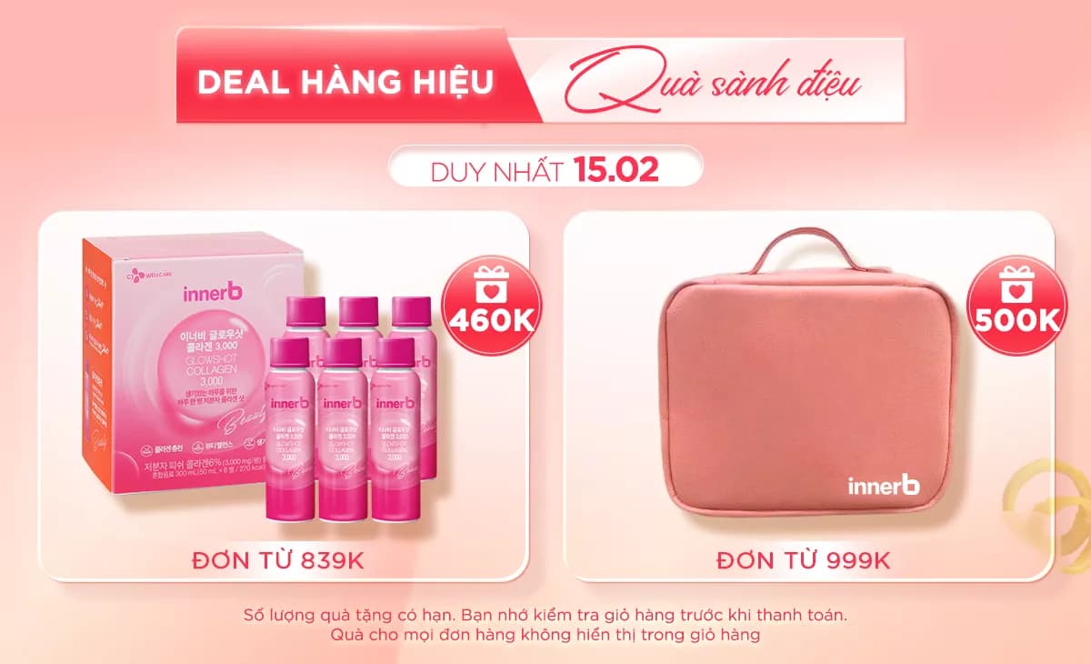 - Tặng ngay hộp nước uống Collagen Vitamin C sáng da InnerB Glowshot trị giá 460k cho đơn hàng từ 839k